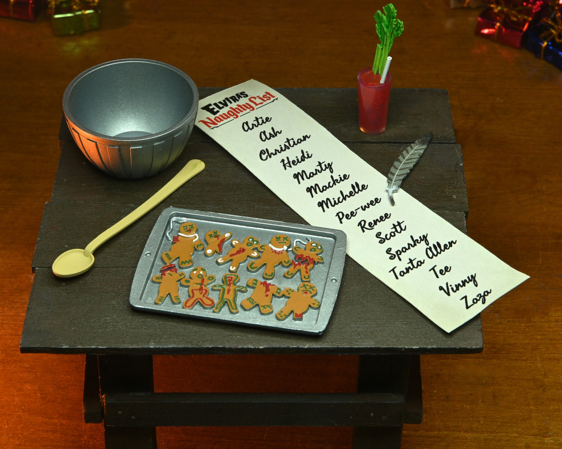 The devilishly delightful Cassandra Peterson has played the part of Elvira for more than 40 years with grace, humor and more than a little camp. NECA is proud to present this hauntingly holiday themed figure for your horror collection. This Deluxe Scary Xmas Elvira 8” action figure is fully articulated and features tailored fabric clothing, two interchangeable expressions, Bloody Mary, naughty list with quill, tray of gingerdead men cookies, and an articulated ‘Creature Who Was Stirring’ figure with tailored fabric apron, bowl, and spoon. Comes in window box packaging with slipcover.