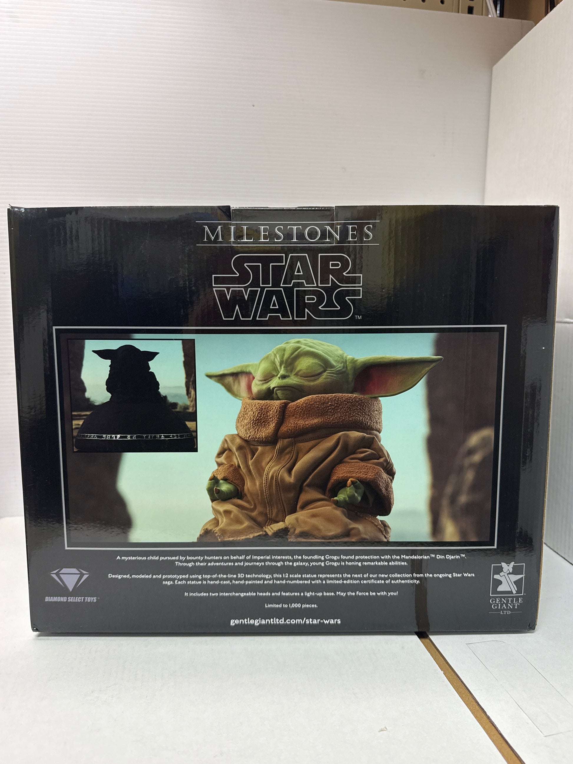 A Gentle Giant Ltd. release! Open your inner eye! Grogu, a.k.a. The Child, sits atop a Jedi Seeing Stone, reaching his mind out into the cosmos in search of a friendly voice. Measuring approximately 8 inches tall, this 1/6 scale statue features lifelike sculpting and hand-painted details, and includes interchangeable eyes-open and eyes-shut heads. Plus, the writing on the seeing stone lights up! It comes packaged in a full-color box with a hand-numbered certificate of authenticity. Limited to only 1000 pieces!