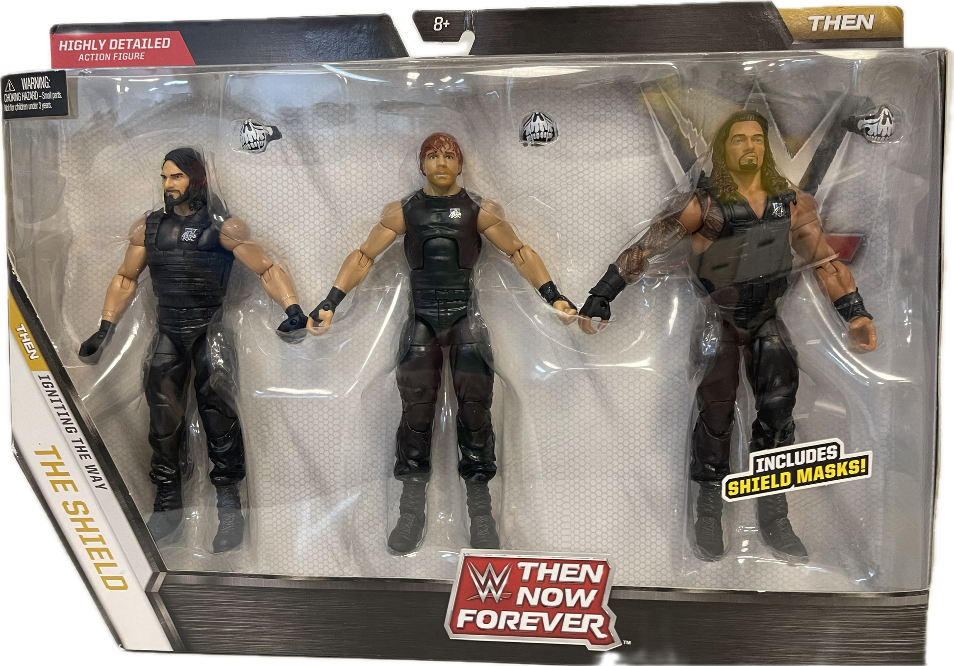 Mattel WWE Then Now Forever Then Igniting The Way The Shield Three Figure Set, new in box. Box shows signs of minor shelf wear.